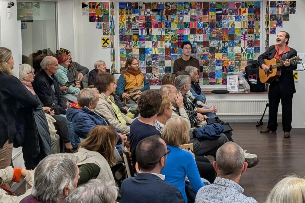 Wipptalherz Offene Tür Nr. 11 mit Ausstellung, Talk, Musik: Motto „Anhalten & Fortfahren“ inkl. Ausstellung der einheimischen KünstlerInnen Walter Csisinko (Zeichnungen) und Manuela Canazei (Malerei), Gespräch und Mundart-Songs des Mannheimer Singer-Songwriters Gringo Mayer (bekannt u.a. aus Inas Nacht / ARD). Wieder ein abwechslungsreicher Abend fand mit Ausstellung, Talk und bewegender Musik in der vollen Kulturraststation statt. Generationenverbindend, mit viel Humor und Tiefgang.