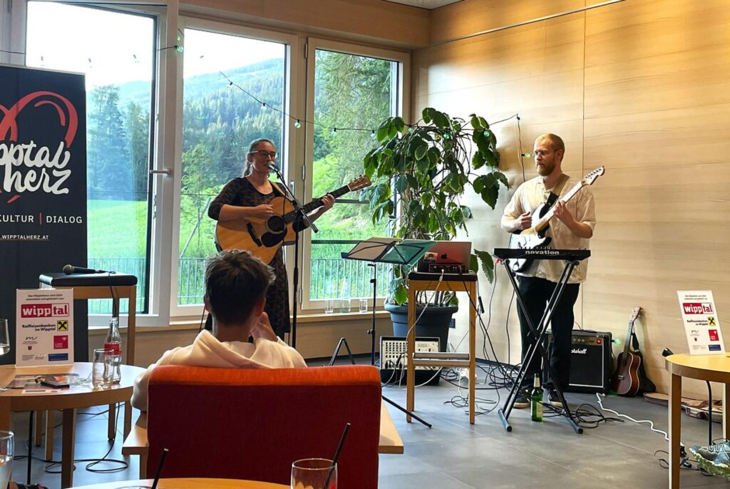 „Wipptalherz Aperitivo # 1 – Summerfeeling“: Indoor (im chilligen Foyer des Bildungshaus St. Michael) traten die Tiroler Singer-Songwriter:innen Julia Costa & Martin Bayer auf, da die Wetterprognosen heftige Gewitter und Regen verkündet hatten, obwohl es dann schlussendlich trocken geblieben war. Trotzdem war es ein sehr gelungenes, unterhaltsames Experiment mit kühlen Drinks, heißer Literatur und berührenden Mundart-Songs vor tollem, zahlreich erschienenem Publikum.